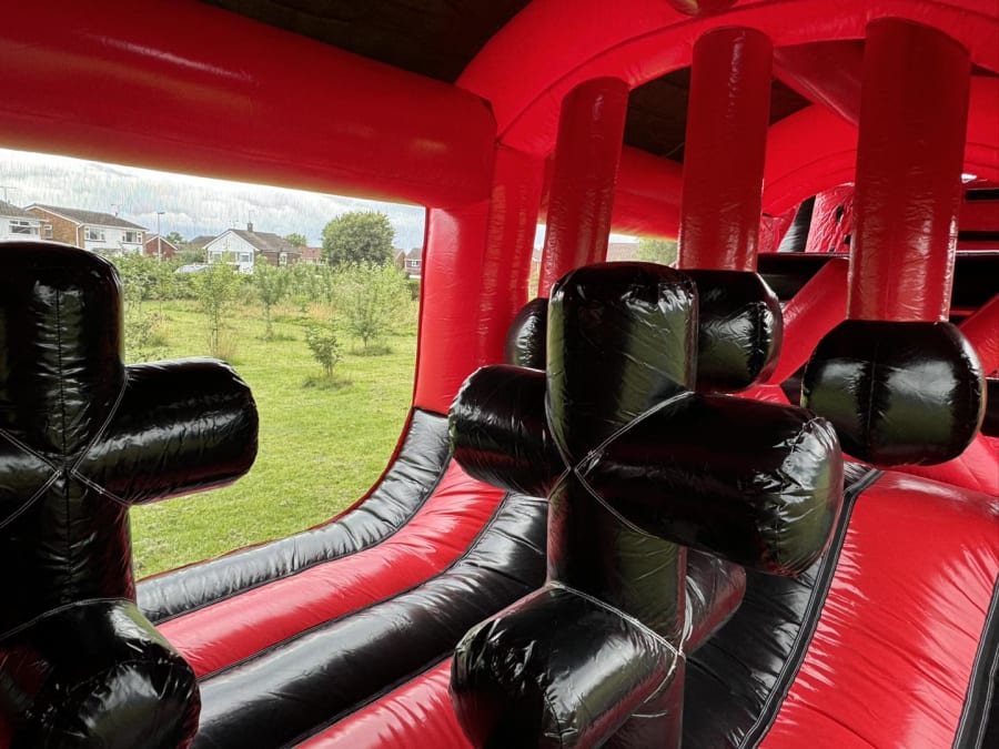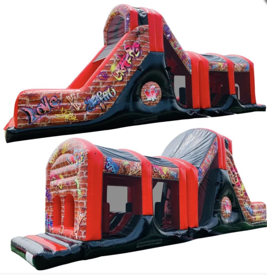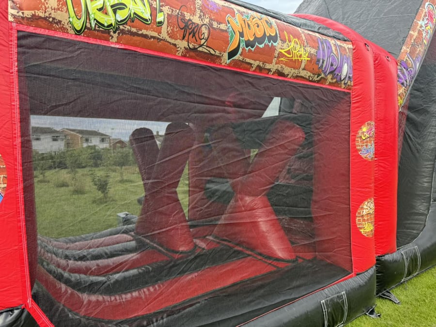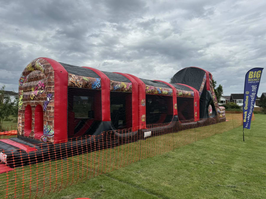 this has just arrived with us and is available as a straight 70ft assault course or we can add a U turn to make it shorter and wider with the slide and entrance both at the same end.